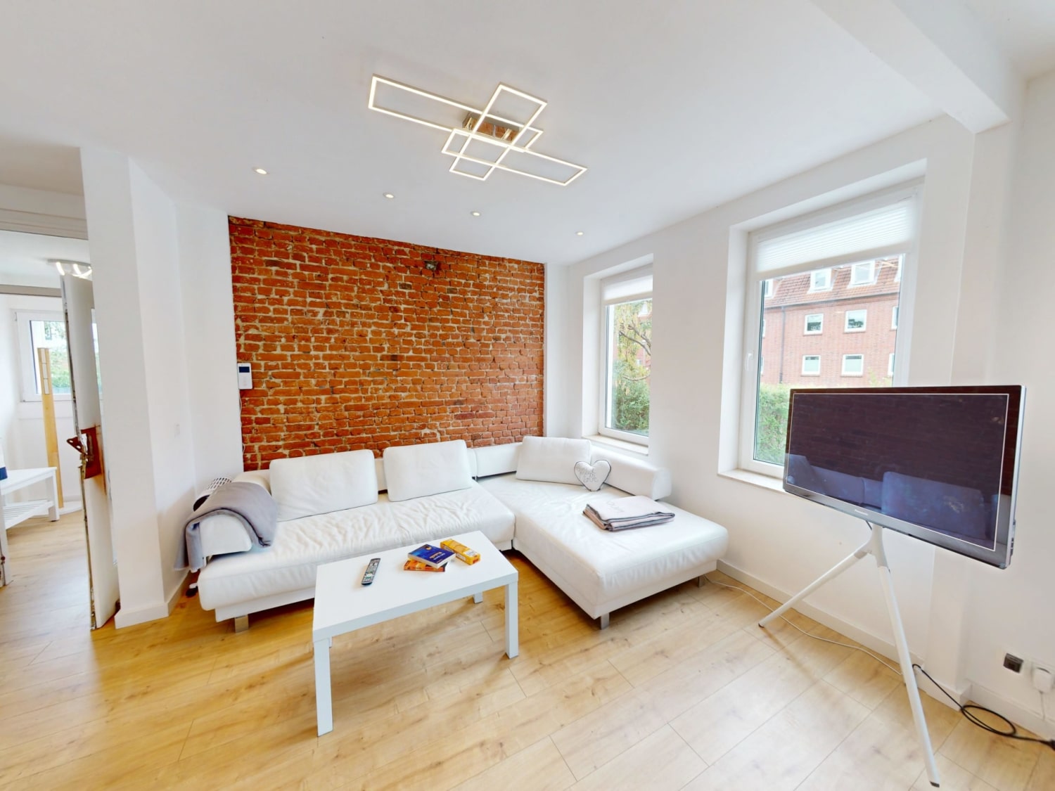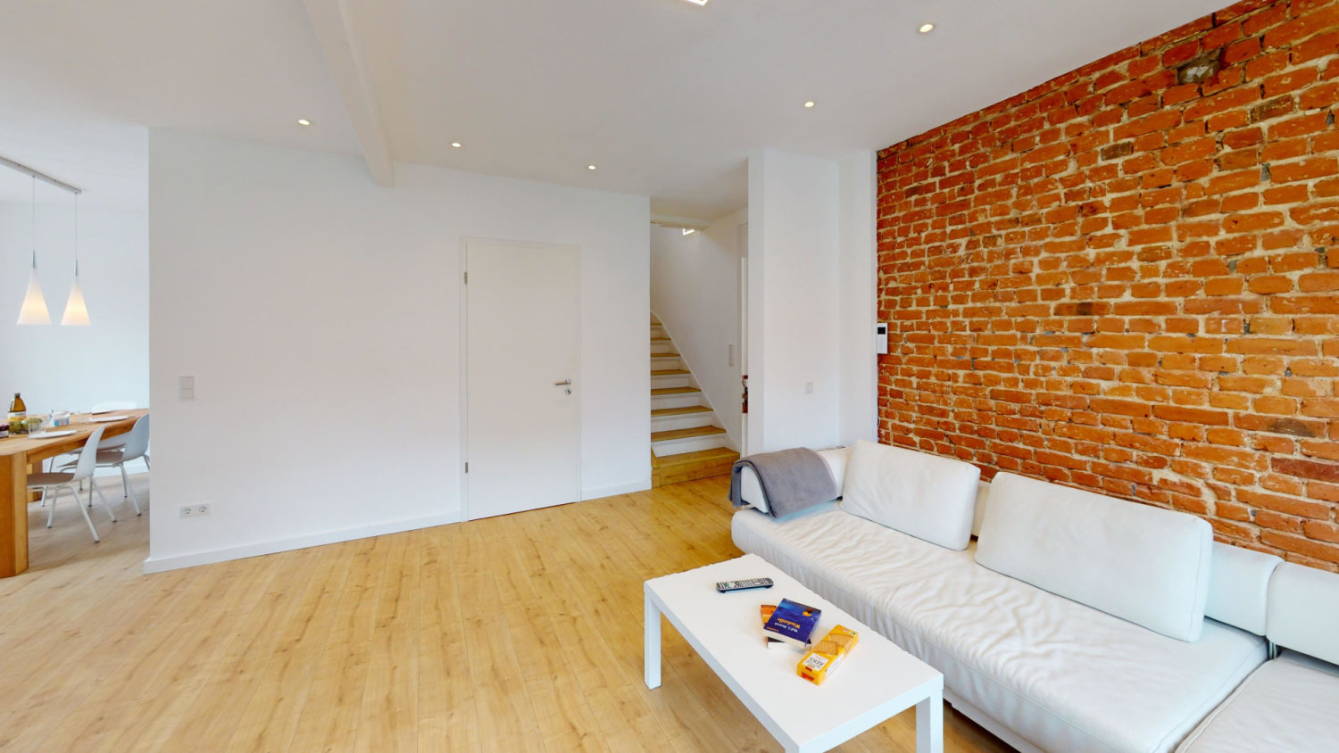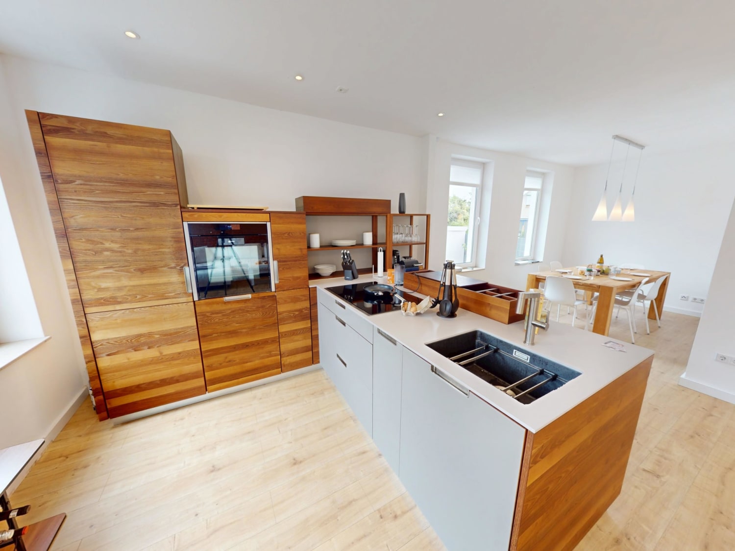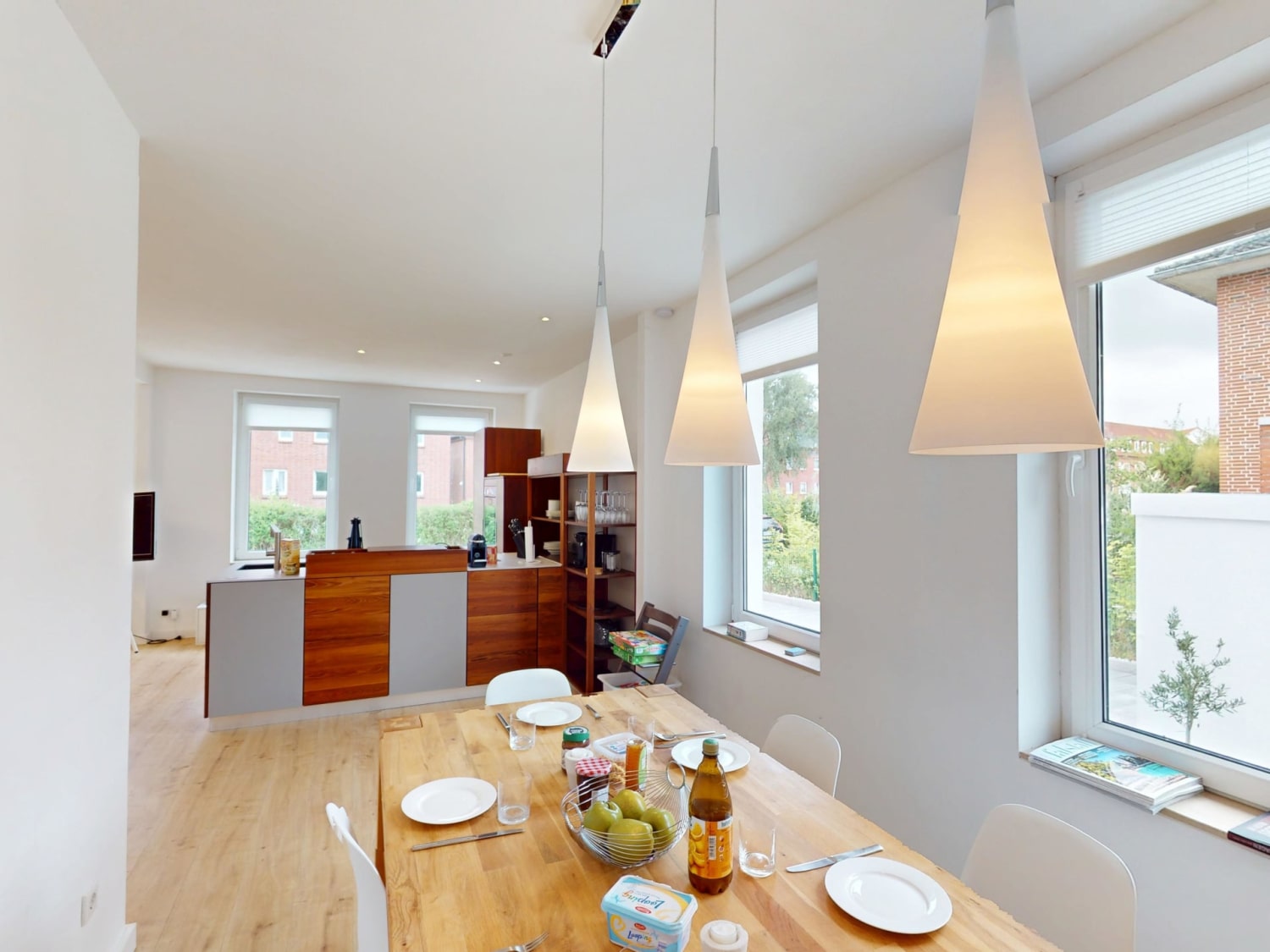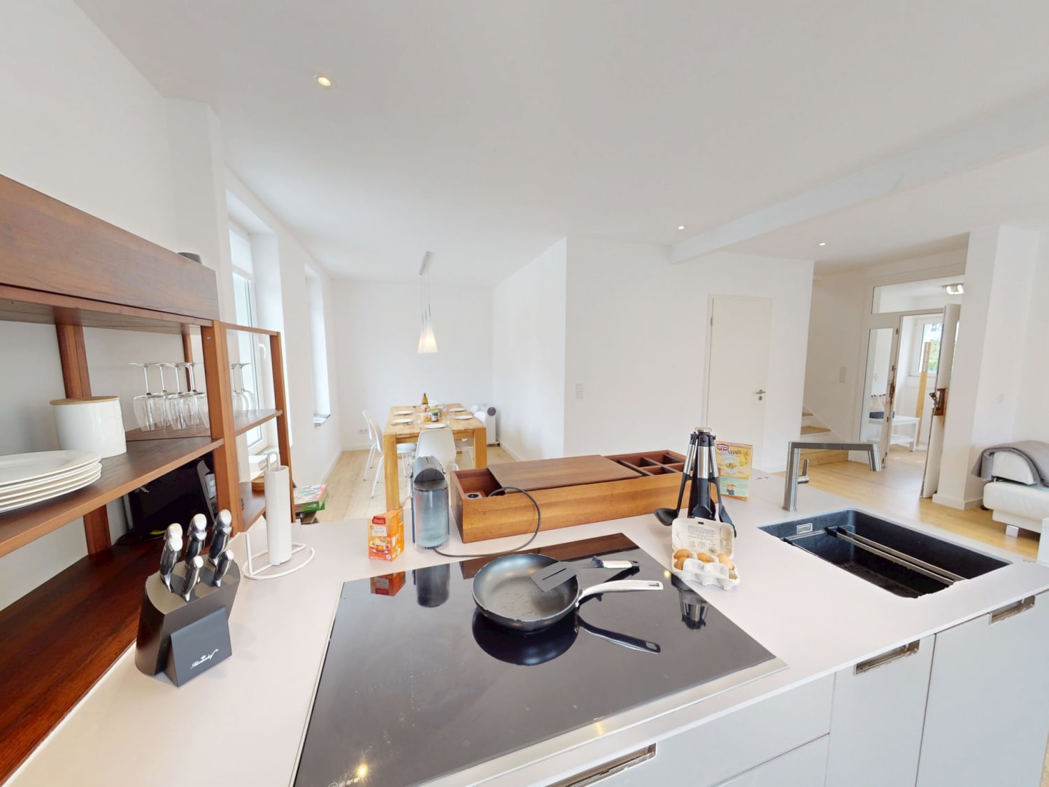Die Küchenzeile bietet dafür jegliche Küchenutensilien, die Sie für eine gelungene Mahlzeit benötigen. Diese können Sie gemeinsam an dem großen Esstisch genießen. Im Anschluss übernimmt die Spülmaschine den Abwasch während Sie im offenen Wohn- und Essbereich den Abend auf dem großen Sofa genießen. Der Fernseher und das kostenfreie W-LAN sorgen für Entertainment.
