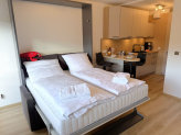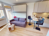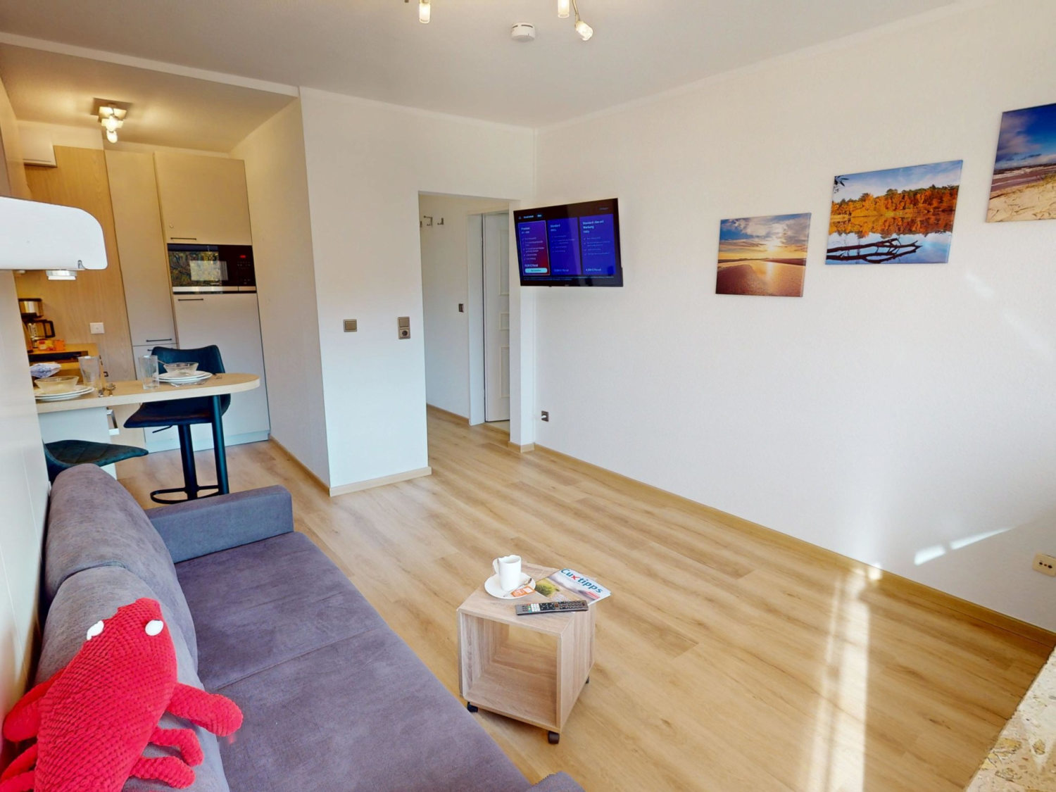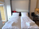 Nach einem Tag voller Erlebnisse am Strand oder in der Umgebung lädt der Wohnbereich zum Abschalten ein: Machen Sie es sich auf dem Sofa bequem, legen Sie die Füße hoch und genießen Sie einen Film oder einfach die Ruhe. Für eine erholsame Nacht klappt sich das praktische Schrankbett im Wohnbereich im Handumdrehen aus – für erholsamen Schlaf und süße Träume.
