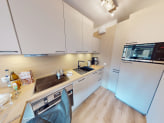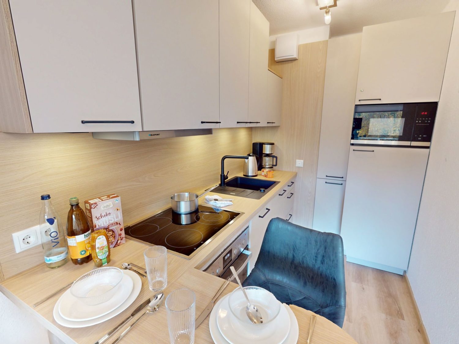 Ihre Ferienwohnung im 3. Obergeschoss erreichen Sie bequem mit dem Fahrstuhl. Sobald Sie eintreten, empfängt Sie der offene Wohn- und Essbereich mit einer warmen, einladenden Atmosphäre – perfekt zum Entspannen und Wohlfühlen. Die voll ausgestattete Küche lädt dazu ein, nach Lust und Laune kleine Leckereien zuzubereiten. Oder Sie lassen den Kochlöffel beiseite und genießen einen Abendspaziergang entlang der Promenade von Sahlenburg, wo nur wenige Minuten entfernt zahlreiche Restaurants auf Sie warten.