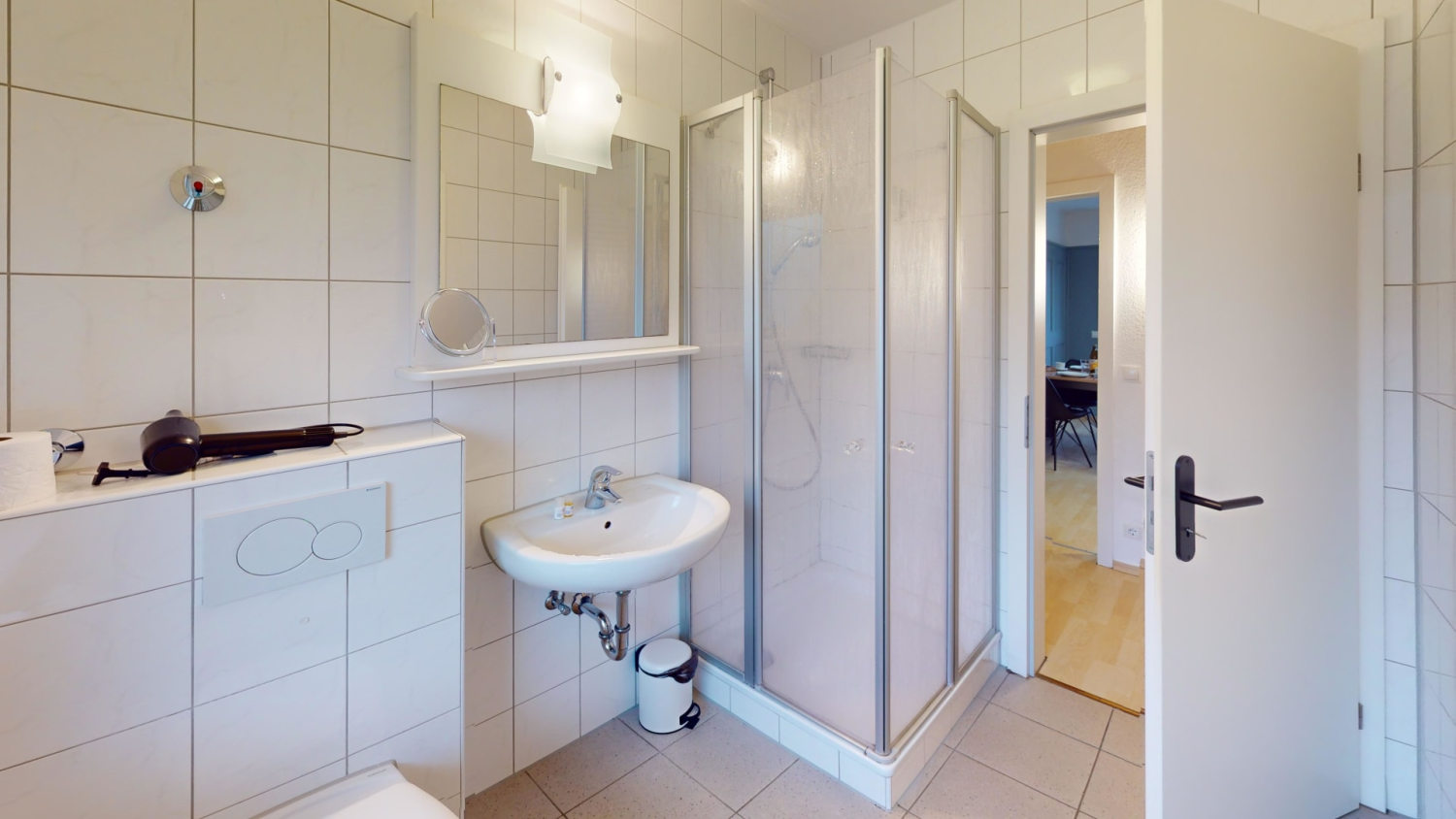 Das Badezimmer der Ferienwohnung ist mit einer Dusche ausgestattet.