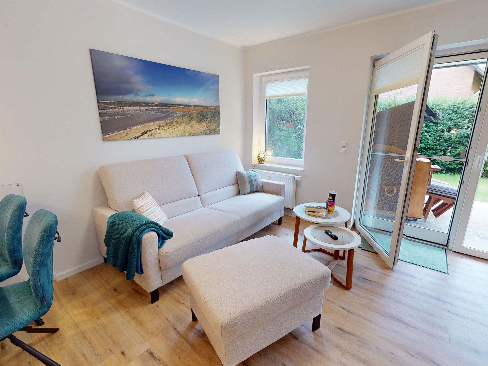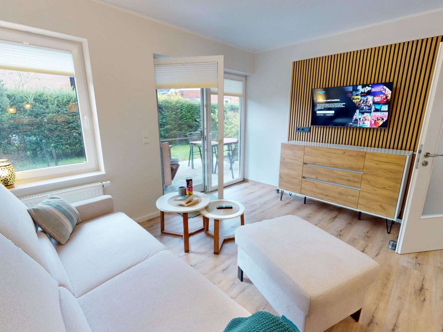 Lassen Sie sich auf der großen Terrasse den ersten Kaffee des Tages schmecken und genießen Sie dabei die morgendliche Sonne. Von der Terrasse gelangen Sie in den offenen Wohn- und Essbereich. Legen Sie sich am Abend, nach einem aufregenden Tag am Strand von Cuxhaven, gemütlich auf die Couch. Für Entertainment sorgt der Fernseher und das kostenfreie W-LAN.