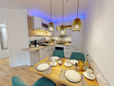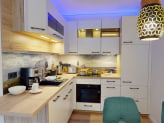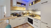 Für ein leckeres Abendessen finden Sie alles, was Sie benötigen, in der vollausgestatteten modernen Küche. Während das Essen auf dem Herd köchelt, können Sie bereits den Esstisch decken und den Blick nach draußen ins Grüne genießen. Nachdem Sie sich gemeinsam am Esstisch das Essen schmecken lassen, übernimmt die Spülmaschine anschließend den Abwasch für Sie.