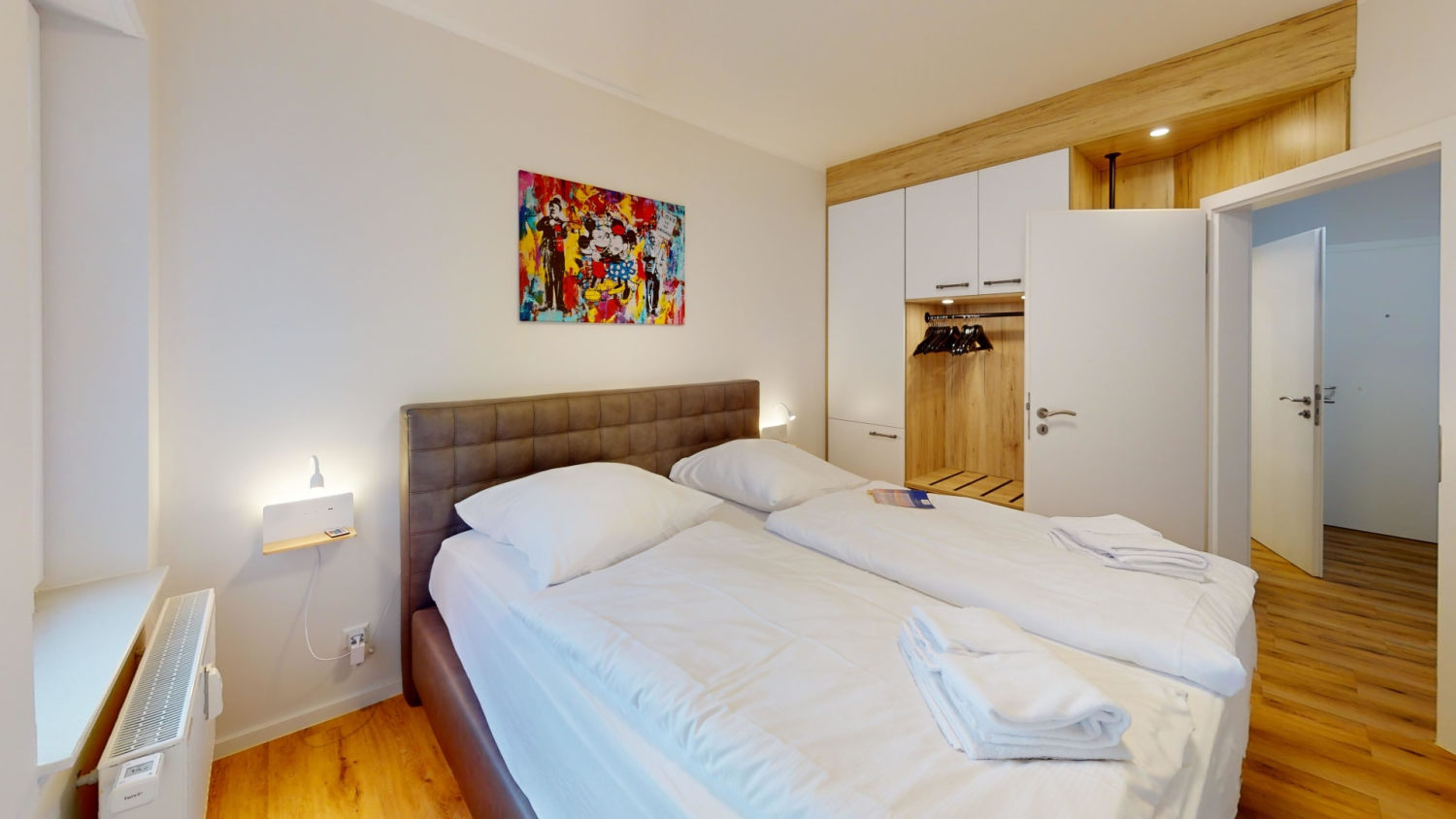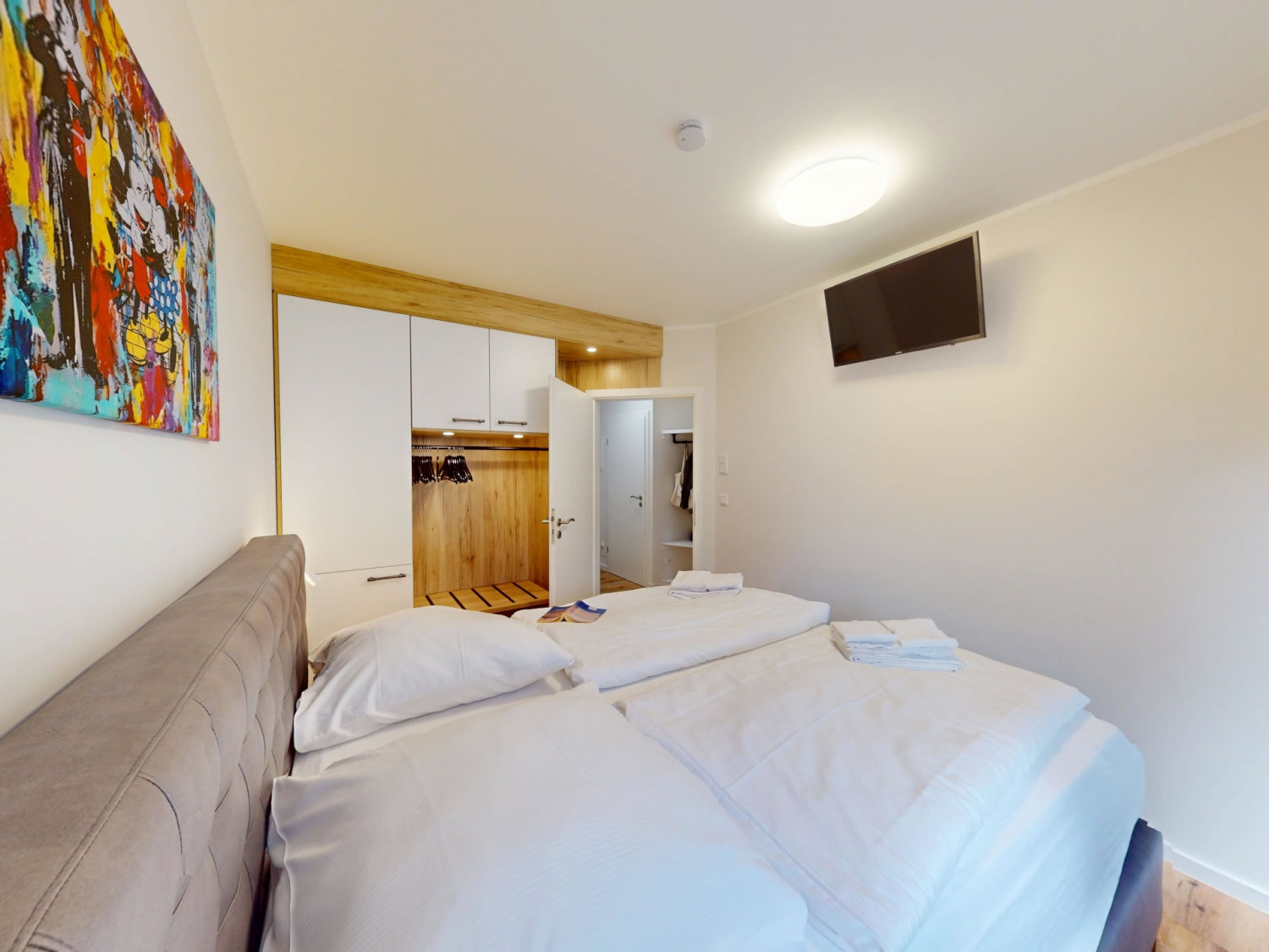 Für erholsame Nächte sorgt das Schlafzimmer mit einem Doppel-Bockspringbett und elektrischen Außenrollos. Der geräumige Kleiderschrank bietet Ihnen Platz, Ihre Kleidung zu verstauen und Ihren Koffer abzulegen. Eine weitere Schlafmöglichkeit bietet die Couch, welche zu einer hochwertigen Schlafcouch umfunktioniert werden kann. Auch im Wohnzimmer sorgen elektrische Außenrollos für ruhige und entspannte Nächte, um gestärkt in den nächsten Urlaubstag zu starten.