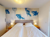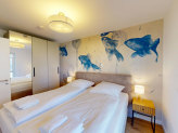 Das Schlafzimmer ist mit einem komfortablen Doppelbett und elektrischen Außenrollos ausgestattet, die für angenehme Dunkelheit und erholsamen Schlaf sorgen.