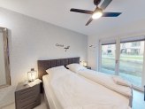 Das separate Schlafzimmer ist mit einem komfortablen Doppelbett ausgestattet und bietet die ideale Umgebung für ruhige, erholsame Nächte. Durch elektrische Außenrollos kann das Schlafzimmer verdunkelt werden und tagsüber bieten Plissees im Schlaf- und Wohnbereich angenehmen Sichtschutz. Deckenventilatoren im Schlafzimmer und auf der Terrasse sorgen gerade in der warmen Jahreszeit für extra Komfort.