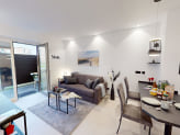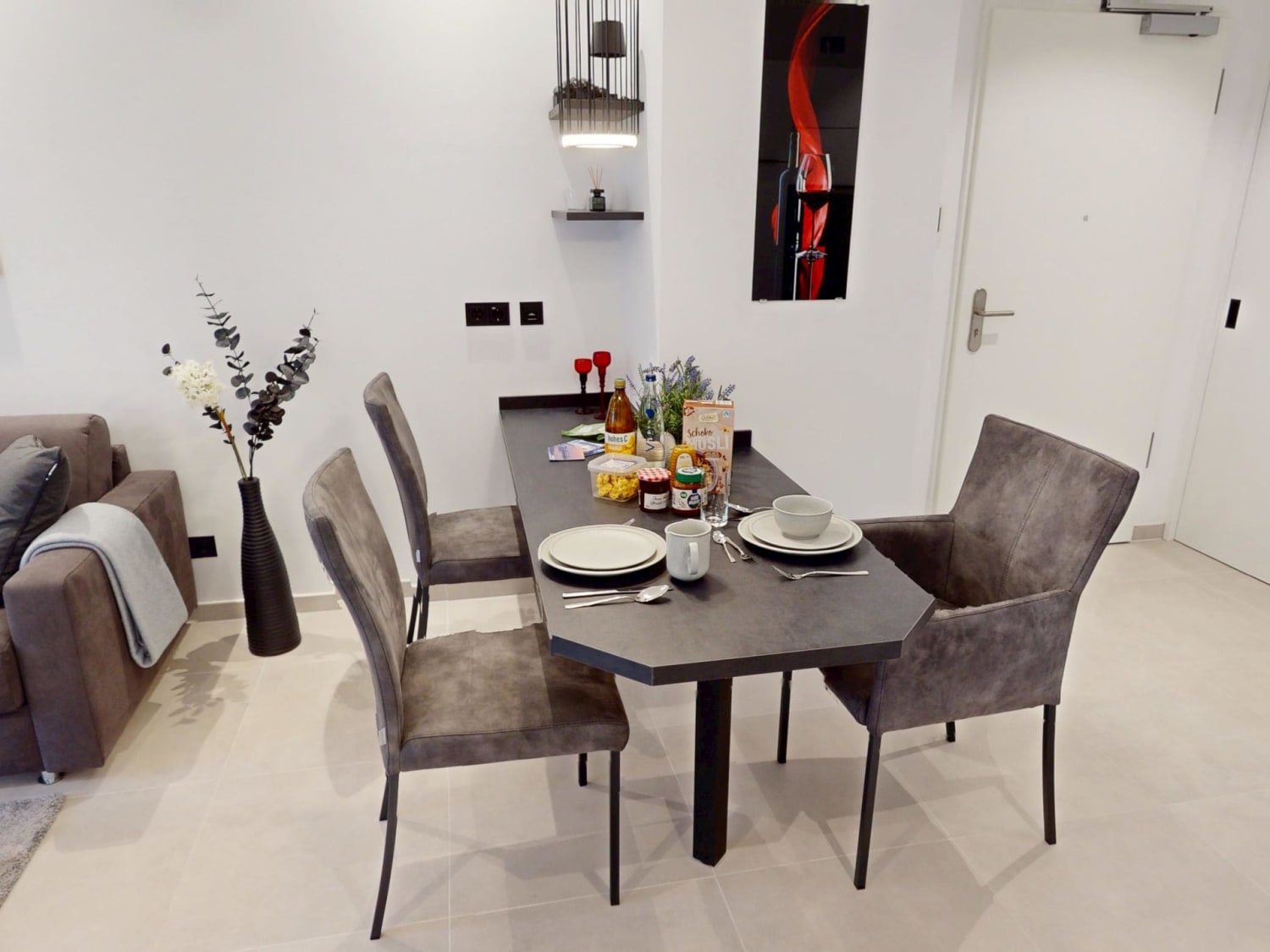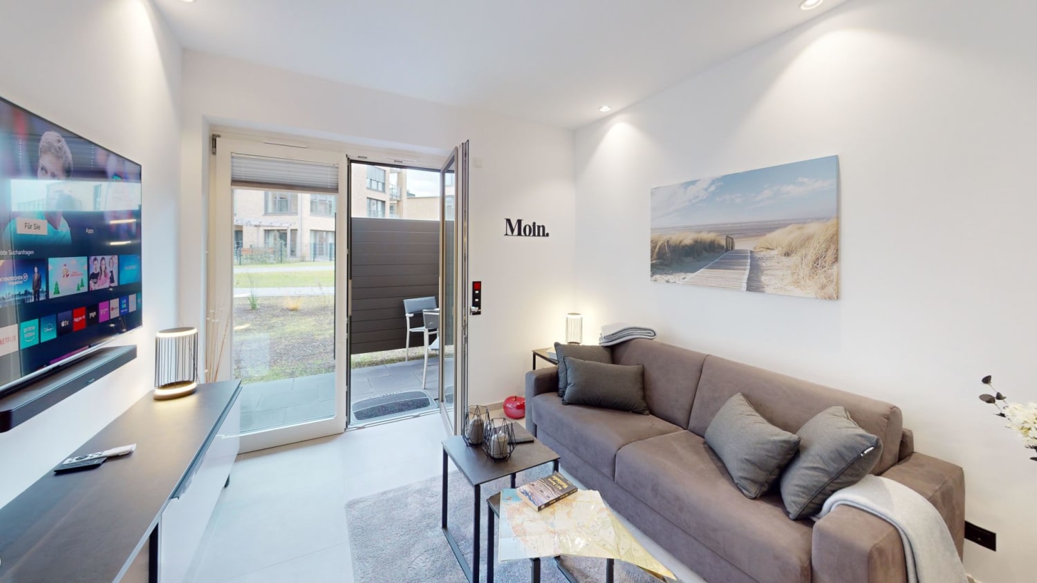 Zurück in der Wohnung genießen Sie den Abend im offenen Wohn- und Essbereich oder auf der angrenzenden Terrasse, wo Sie die frische Meeresluft bei einem Glas Wein auf sich wirken lassen. Für Unterhaltung sorgen zwei Smart-TVs und kostenloses WLAN.