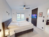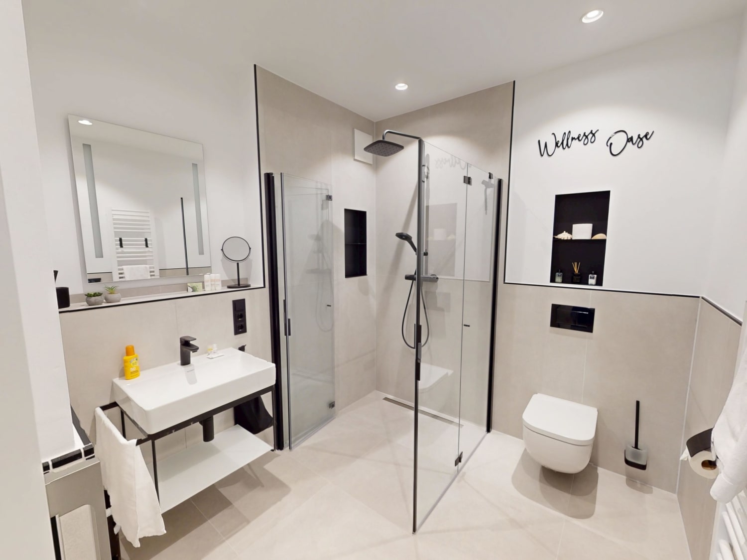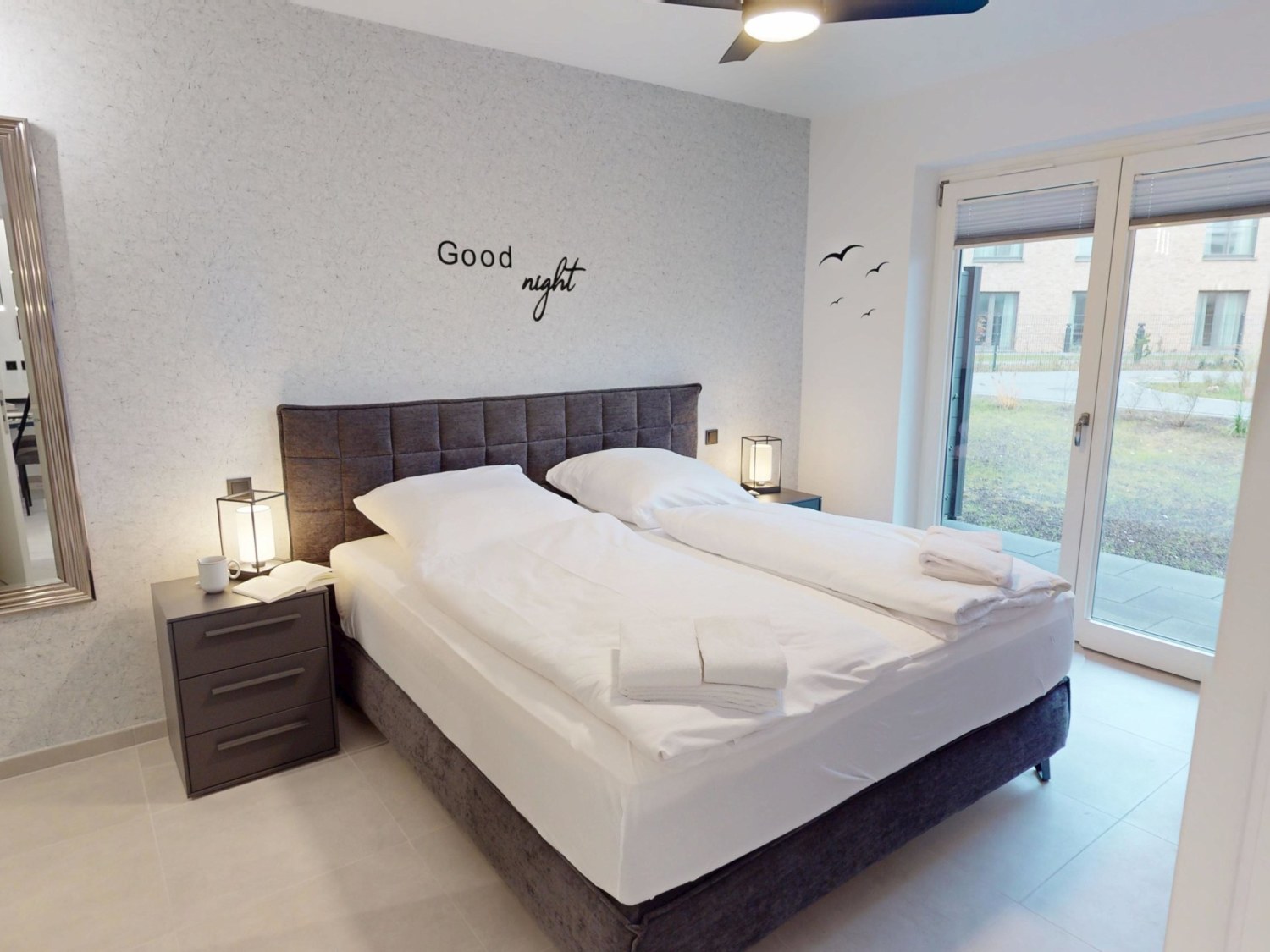 Das separate Schlafzimmer ist mit einem komfortablen Doppelbett ausgestattet und bietet die ideale Umgebung für ruhige, erholsame Nächte. Das Badezimmer überzeugt mit klarer Gestaltung und einer belebenden Dusche – perfekt für eine Erfrischung nach einem sonnigen Tag am Meer.