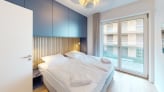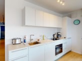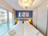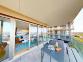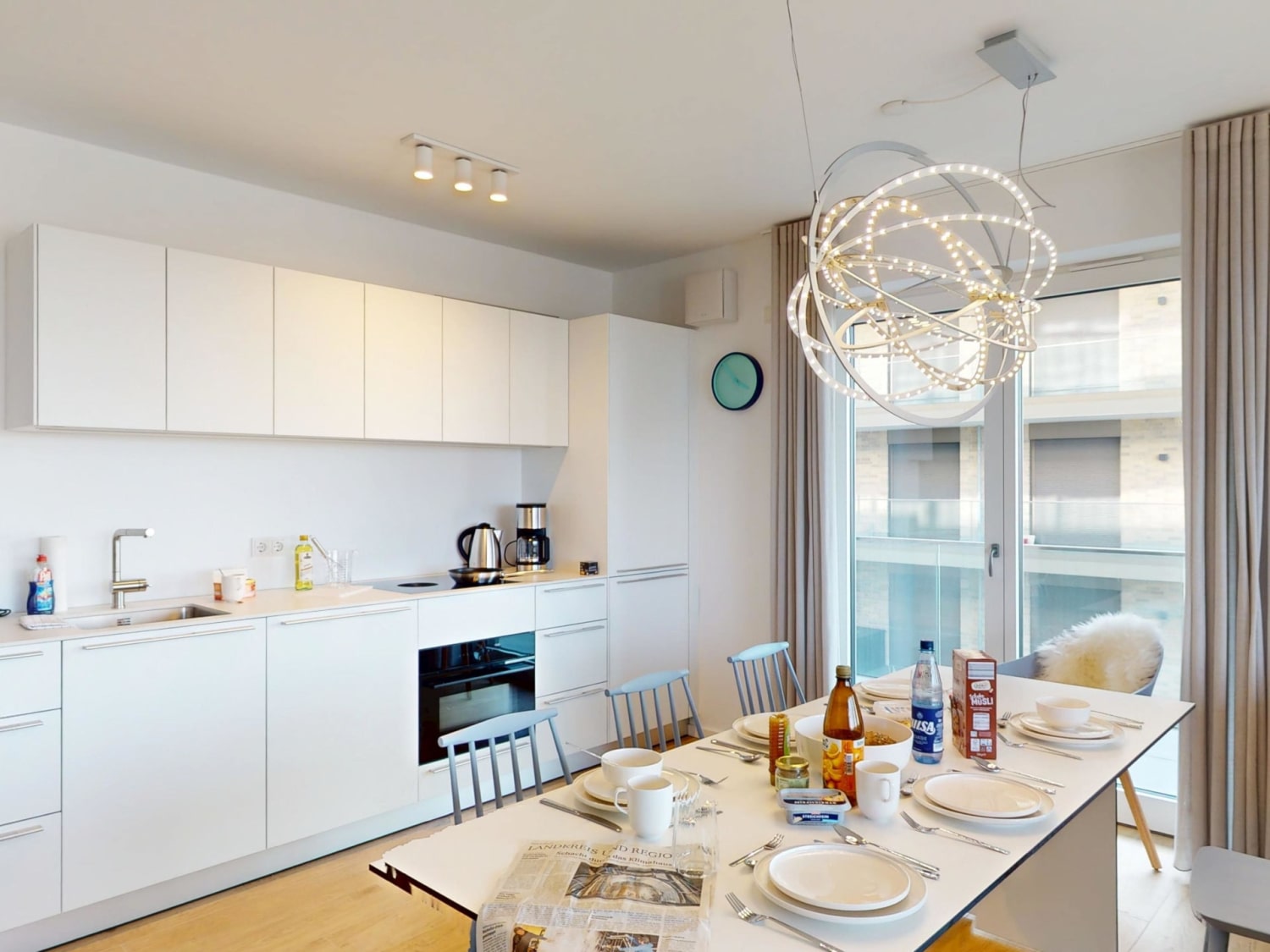 Das Herzstück der Wohnung ist der offene Wohn- und Essbereich. Bereiten Sie in der voll ausgestatteten Küche frische Mahlzeiten zu und genießen Sie diese anschließend gemeinsam am großen Esstisch. Die stilvolle Bogenlampe über dem Ecksofa schafft eine gemütliche Atmosphäre – ideal für entspannte Abende mit einem Film auf dem Smart-TV, während die Sonne langsam im Meer versinkt. Kostenloses WLAN sorgt zusätzlich für Unterhaltung und Komfort.