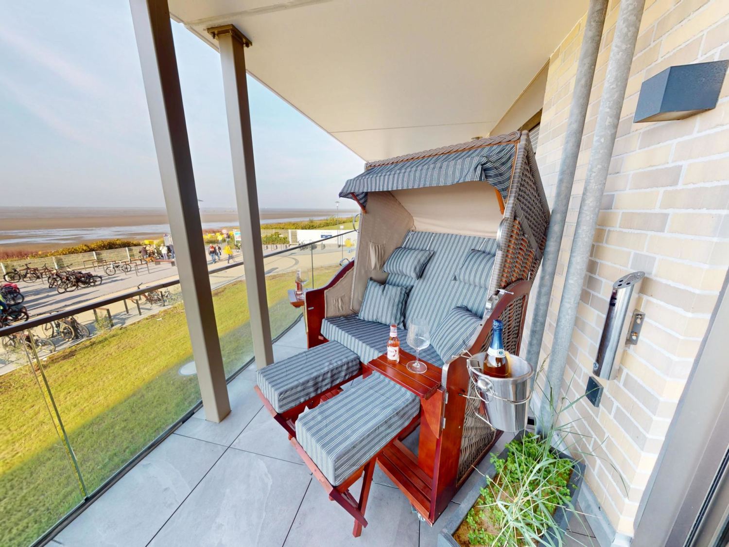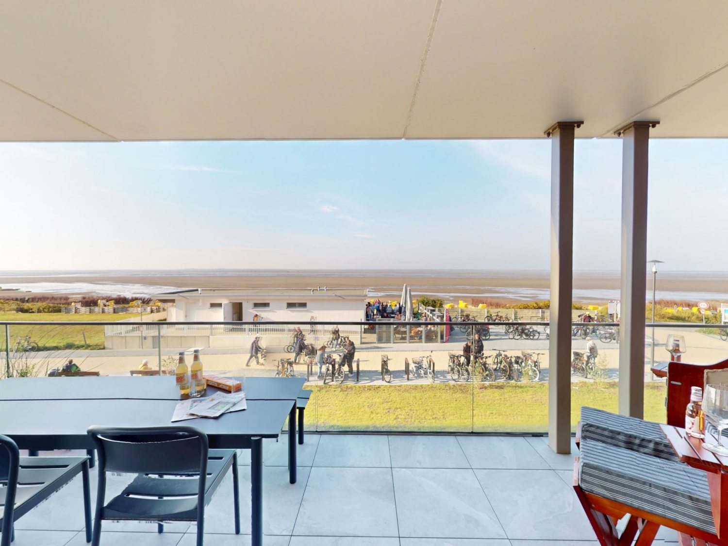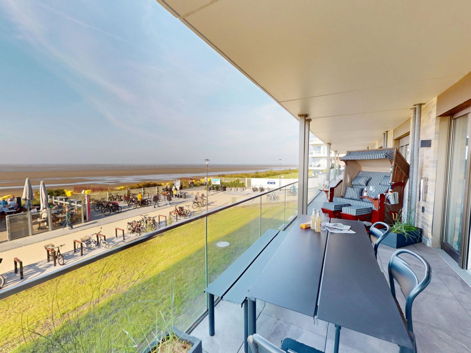 Das Highlight der Ferienwohnung ist die umlaufende Terrasse mit unverbautem Blick auf das UNESCO-Weltnaturerbe Wattenmeer und die Insel Neuwerk. Starten Sie den Tag mit einem Frühstück an der frischen Nordseeluft oder lassen Sie ihn im Strandkorb mit einem Glas Sekt aus dem Sektkühler ausklingen.
