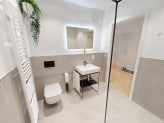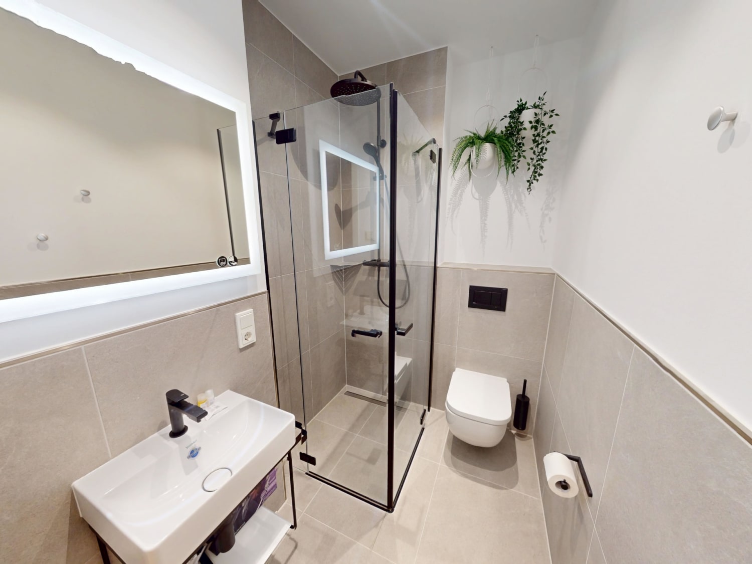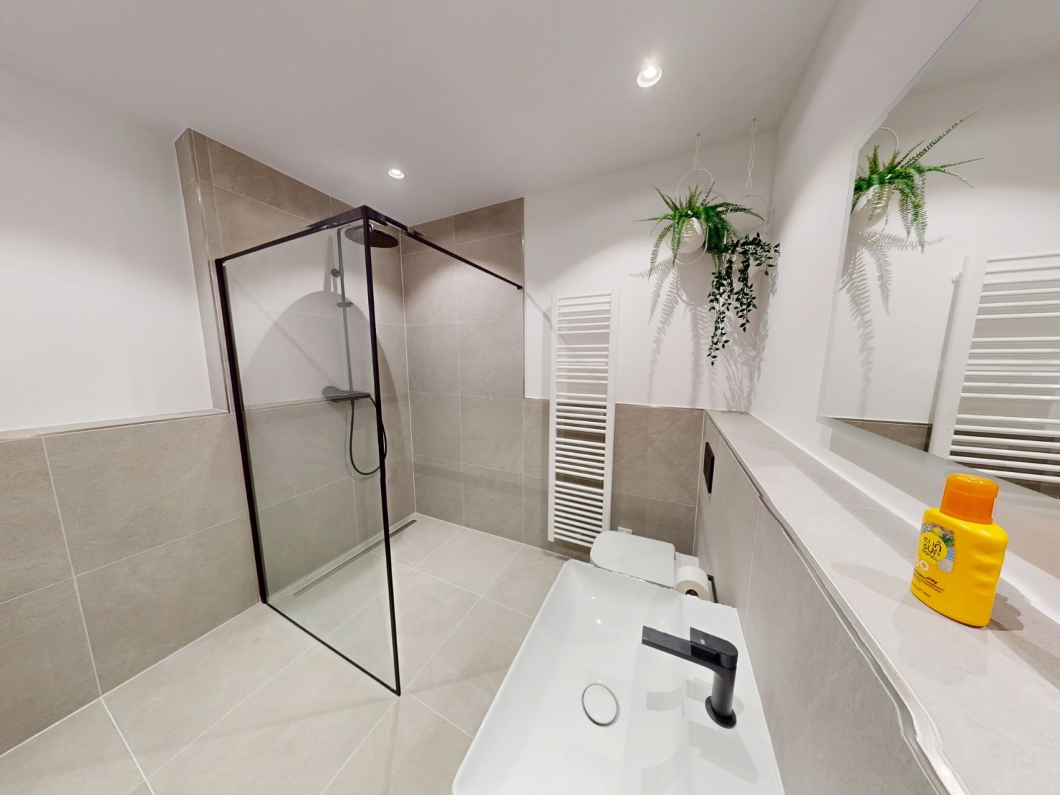 Zwei moderne Badezimmer mit ebenerdigen, großzügigen Duschen sorgen für zusätzlichen Komfort. Ein integrierter Wäschetrockner steht Ihnen bei Bedarf ebenfalls zur Verfügung – ideal sollte Ihre Kleidung nach einem langen Strandtag mal gereinigt werden müssen.